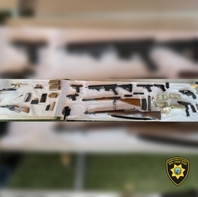 A search warrant was granted and officers were able to access the safe where they found four handguns, three rifles, two replica firearms, hundreds of rounds of ammunition, and more than $7,000 in cash and jewelry. The guns recovered were identical to the ones that Sanchez was holding in the photo.